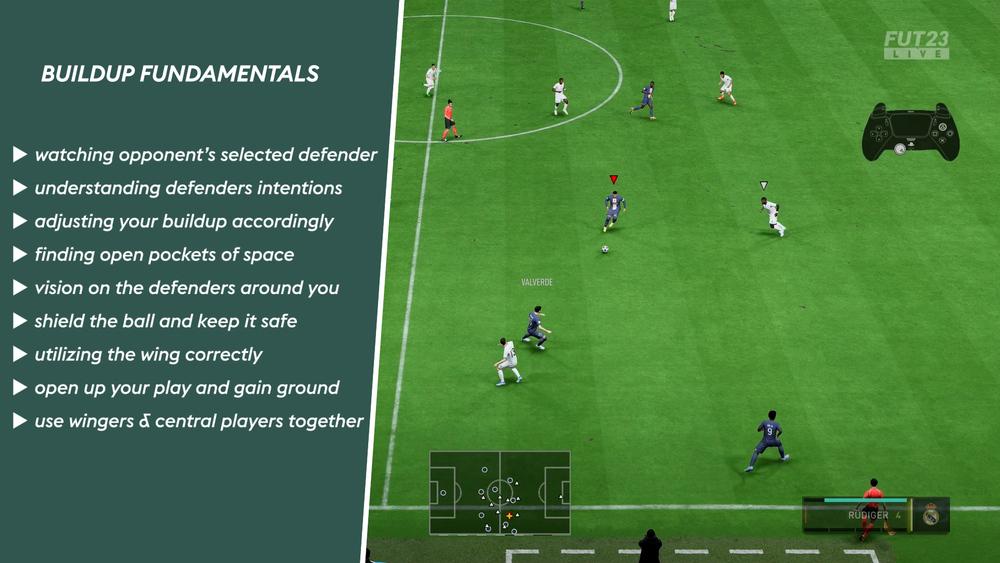 • อย่าหันหลังให้คู่แข่งตอนรับบอล: ก่อนบอลถึงตัว ให้ดูว่าคู่แข่งมาจากทิศไหน แล้วโยกอนาล็อกซ้ายไปทิศตรงข้าม หรือกด R1/RB ค้าง เพื่อปล่อยบอลลอดขา (Dummy) หากมีพื้นที่ด้านหลัง